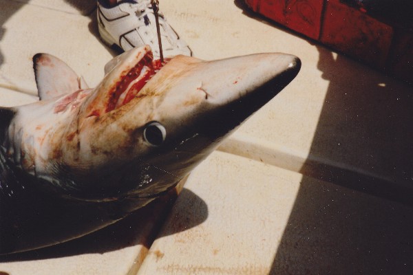 Up at 6 a.m. to go fishing. Merv and I were supposed to catch a bus to Vilmoura at 7:30 or 7:45, neither of which showed up. Called a taxi and made it to the marina by 8:15 a.m. for our fishing trip at 9:00 a.m. The boat was a 10 meter (31') deep sea fishing boat with a crew of two. There were supposed to be 8 of us, but 4 didn't show up, which gave us all lots of room. click picture to enlarge Our partners were two German Air Force fellows, who were stationed out of Viseau here in Portugal. Finally, off we went at 9:30 a.m. and onto the open sea. click picture to enlarge Good wind up, with a fairly rough sea. Up and down, back and forth, we finally made it to 45 meters (150') of water and rigged for shark. That consisted of a rod each with 100 lb. test line, a single hook and a foot long bait fish threaded on. Fishing consisted of drifting, with about 50' of line out. To attract sharks, they filled a mesh bag with a mash of fish which trailed alongside the boat. click picture to enlarge Michael (one of the Germans) got a strike at 11:45 a.m. and hooked one at 12:10 p.m., a 6' long blue shark (Mako). Lots of excitement in the boat when he came aboard. Took 15 minutes with a baseball bat to settle him down. click picture to enlarge On the way back in the boat, I asked Michael where he was from in Germany. I found out he was from Butzbach, where Lee spent a week last year. Small world. The boys gave us a round-about ride back to our resort, where Lee and Carole had been sunning and shopping all day. Up the hill for supper, back to the room for 3 games of rummy tiles and off to bed at 10:30 p.m. click picture to enlarge |